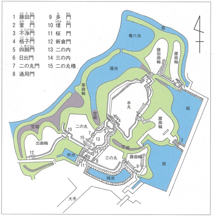 見どころの一つとして、大手道から城に向かう曲道から桜門を見ると、桜門、石垣、二の丸櫓などが立ち並んで見えます。この場所から見る景色は当時の人々に権威を感じさせていたことでしょう。