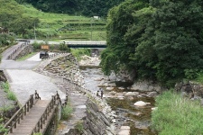 (1)交流センターから坂を上がり、行戸バス停から坂を下った川原(徒歩10分)。岩が飛び石のように並べられ、滝のそばまで近づくことができます。